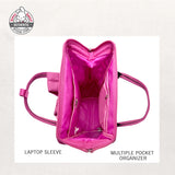 2 way zippered main compartment with padded laptop/tablet sleeve and additional 1 way zippered mesh pockets and slip pocket with velcro closure inside