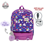 2 way zippered main compartment with Built-in USB port for charging with free cable that easily connects to the power bank pocket inside